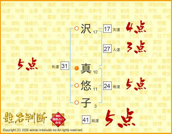 沢(17画) 真(10画)悠(11画)子(3画)