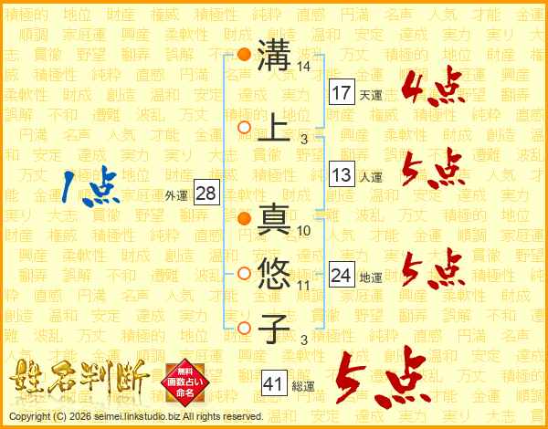 溝(14画)上(3画) 真(10画)悠(11画)子(3画)