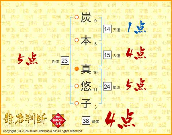 炭(9画)本(5画) 真(10画)悠(11画)子(3画)