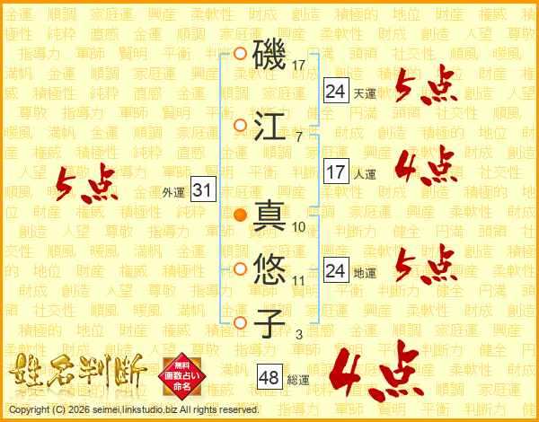 磯(17画)江(7画) 真(10画)悠(11画)子(3画)