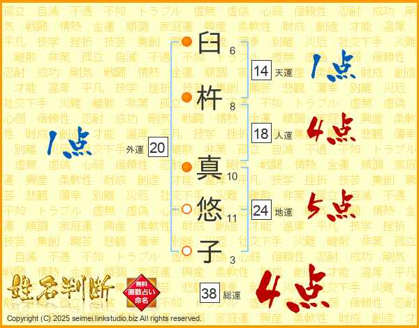 臼(6画)杵(8画) 真(10画)悠(11画)子(3画)