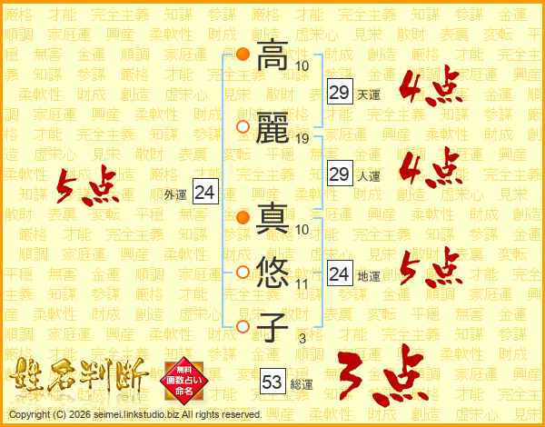 高(10画)麗(19画) 真(10画)悠(11画)子(3画)