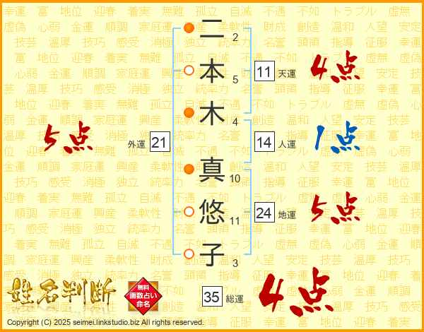二(2画)本(5画)木(4画) 真(10画)悠(11画)子(3画)