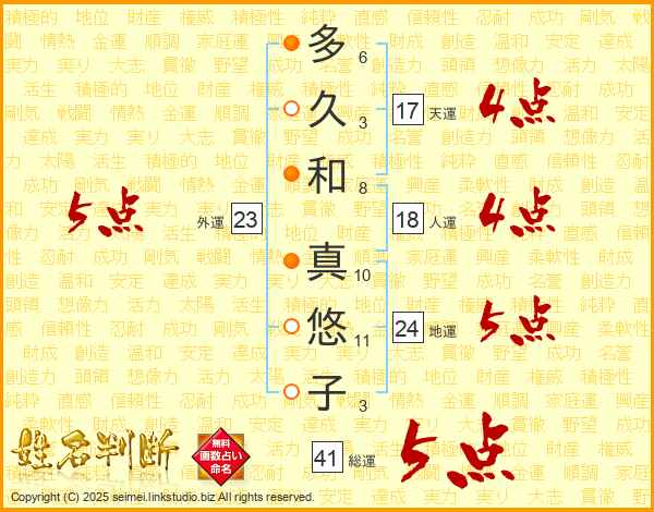 多(6画)久(3画)和(8画)  真(10画)悠(11画)子(3画)