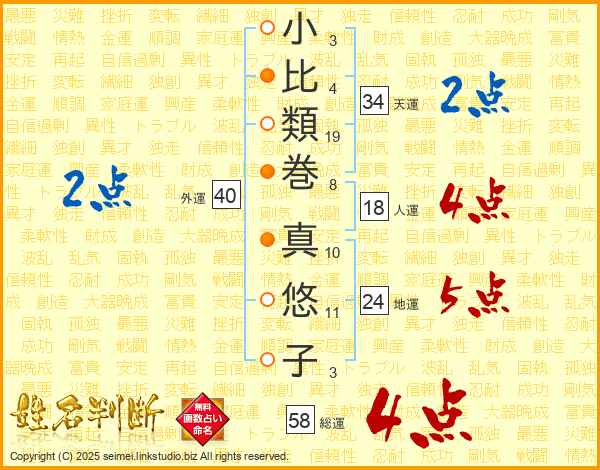 小(3画)比(4画)類(19画)巻(8画) 真(10画)悠(11画)子(3画)