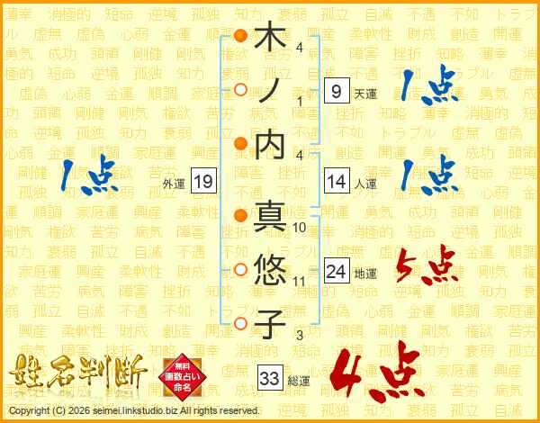 木(4画)ノ(1画)内(4画) 真(10画)悠(11画)子(3画)