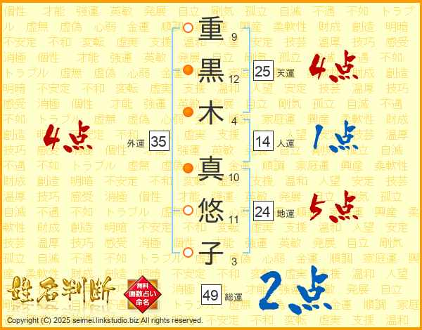 重(9画)黒(12画)木(4画) 真(10画)悠(11画)子(3画)