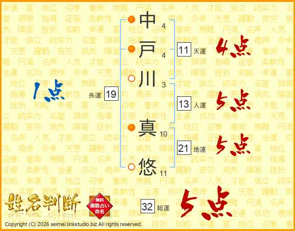 中(4画)戸(4画)川(3画) 真(10画)悠(11画)