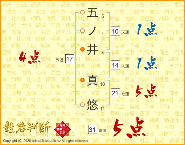 五(5画)ノ(1画)井(4画) 真(10画)悠(11画)