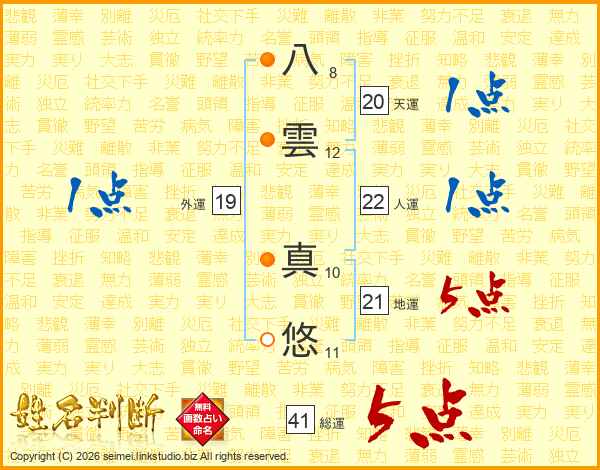 八雲真悠さんの総運は41画の5点!