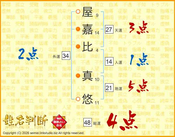 屋(9画)嘉(14画)比(4画) 真(10画)悠(11画)