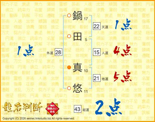 鍋(17画)田(5画) 真(10画)悠(11画)