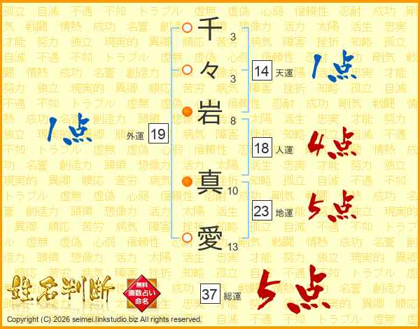 千々岩真愛さんの総運は37画の5点!