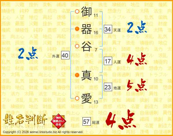 御(11画)器(16画)谷(7画) 真(10画)愛(13画)
