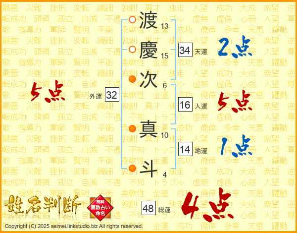 渡(13画)慶(15画)次(6画) 真(10画)斗(4画)