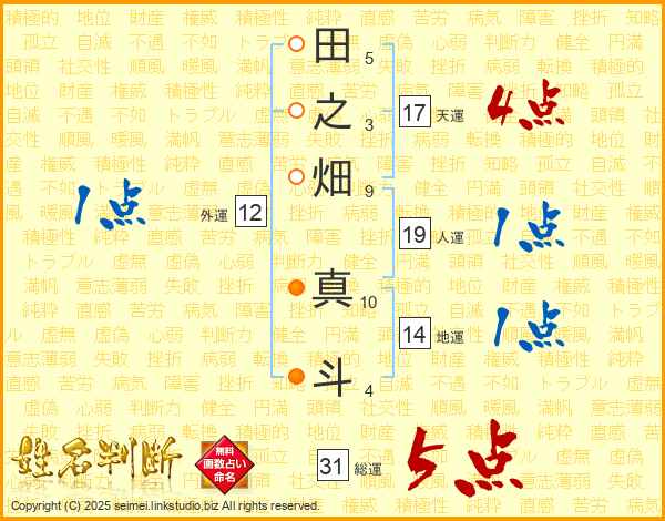 田(5画)之(3画)畑(9画) 真(10画)斗(4画)