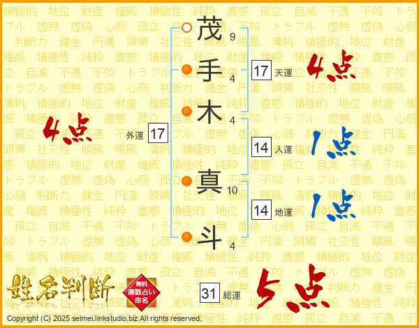 茂手木真斗さんの外運は17画の4点!