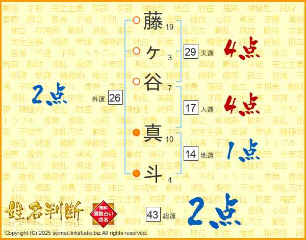 藤(19画)ヶ(3画)谷(7画) 真(10画)斗(4画)