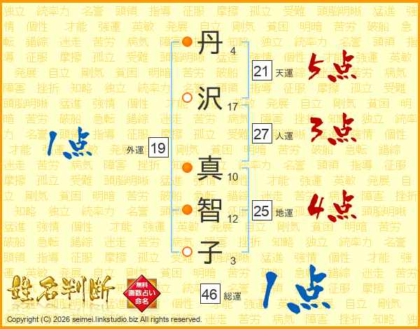 丹(4画)沢(17画) 真(10画)智(12画)子(3画)