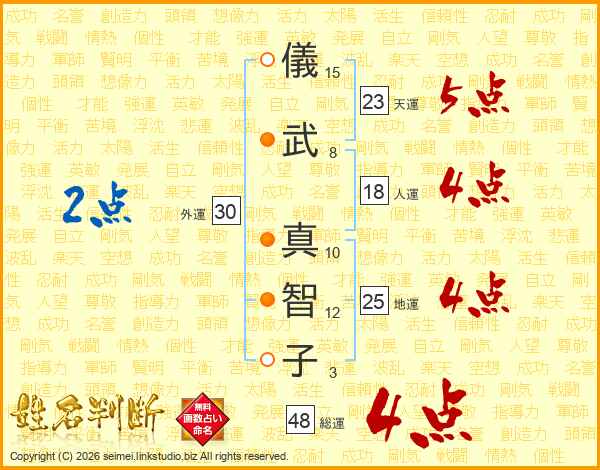 儀(15画)武(8画) 真(10画)智(12画)子(3画)