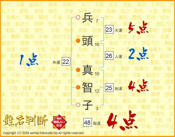 兵(7画)頭(16画) 真(10画)智(12画)子(3画)