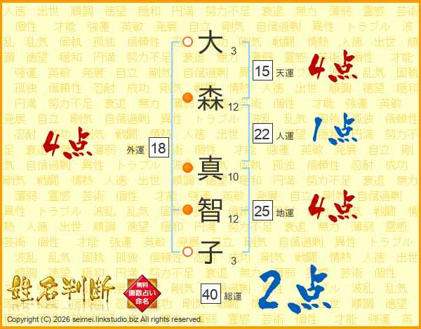 大(3画)森(12画) 真(10画)智(12画)子(3画)