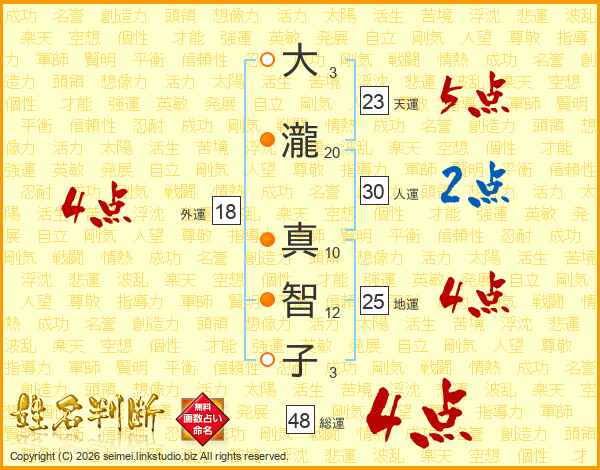 大(3画)瀧(20画) 真(10画)智(12画)子(3画)