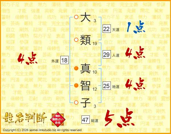 大(3画)類(19画) 真(10画)智(12画)子(3画)