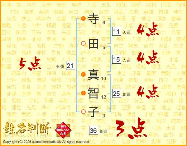 寺(6画)田(5画) 真(10画)智(12画)子(3画)