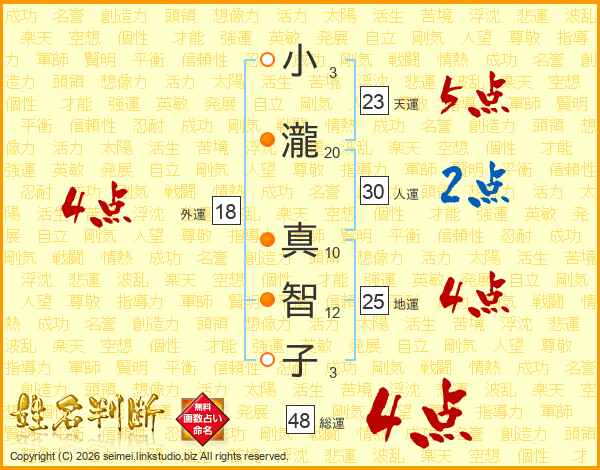 小(3画)瀧(20画) 真(10画)智(12画)子(3画)
