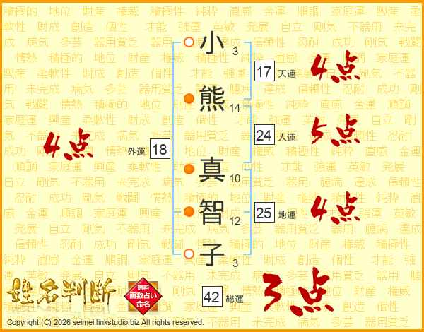 小(3画)熊(14画) 真(10画)智(12画)子(3画)