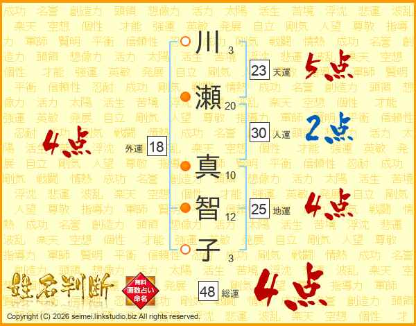 川(3画)瀬(20画) 真(10画)智(12画)子(3画)