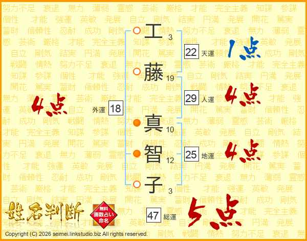 工(3画)藤(19画) 真(10画)智(12画)子(3画)