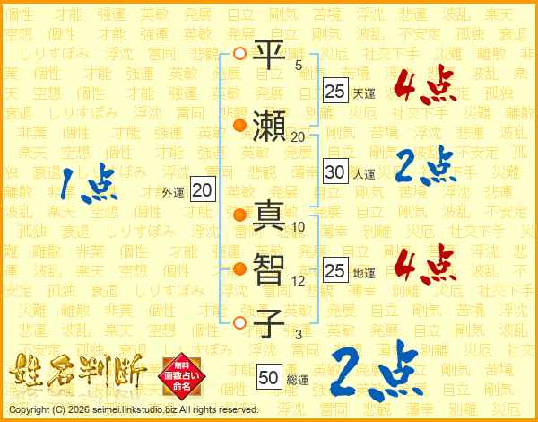 平(5画)瀬(20画) 真(10画)智(12画)子(3画)