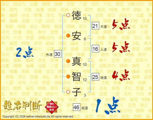 徳(15画)安(6画) 真(10画)智(12画)子(3画)