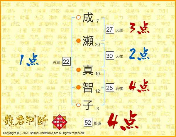 成(7画)瀬(20画) 真(10画)智(12画)子(3画)