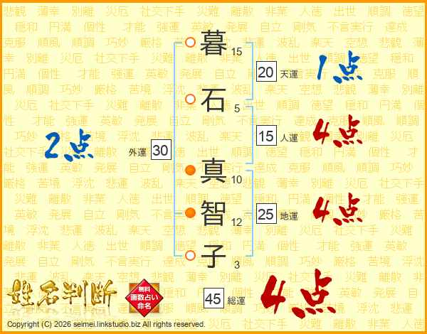 暮(15画)石(5画) 真(10画)智(12画)子(3画)