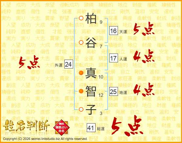 柏(9画)谷(7画) 真(10画)智(12画)子(3画)