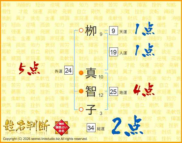 栁(9画) 真(10画)智(12画)子(3画)