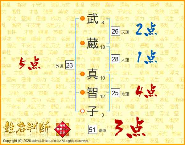 武(8画)蔵(18画) 真(10画)智(12画)子(3画)