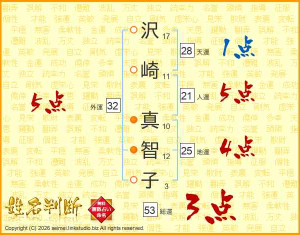 沢(17画)崎(11画) 真(10画)智(12画)子(3画)