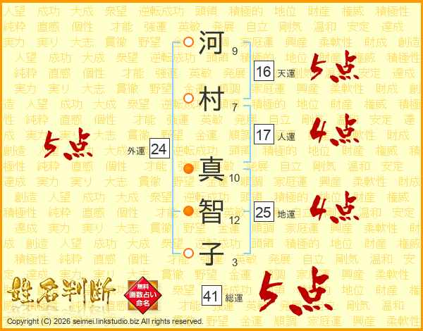 河(9画)村(7画) 真(10画)智(12画)子(3画)