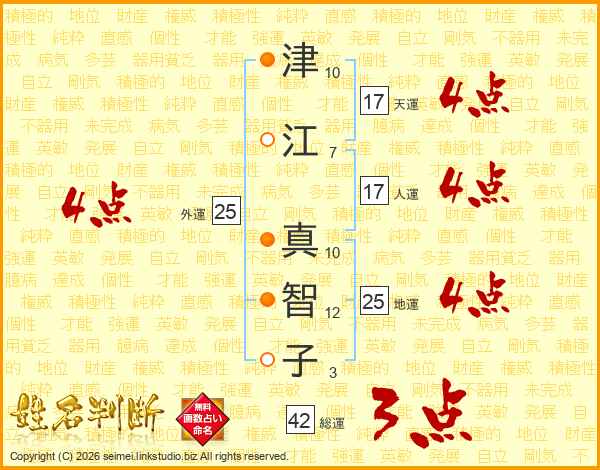 津(10画)江(7画) 真(10画)智(12画)子(3画)