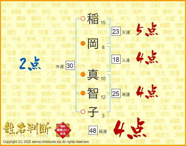 稲(15画)岡(8画) 真(10画)智(12画)子(3画)