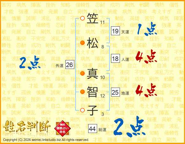 笠(11画)松(8画) 真(10画)智(12画)子(3画)