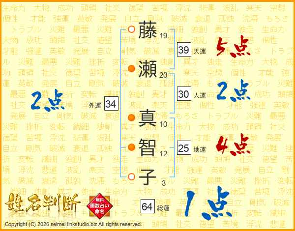 藤(19画)瀬(20画) 真(10画)智(12画)子(3画)