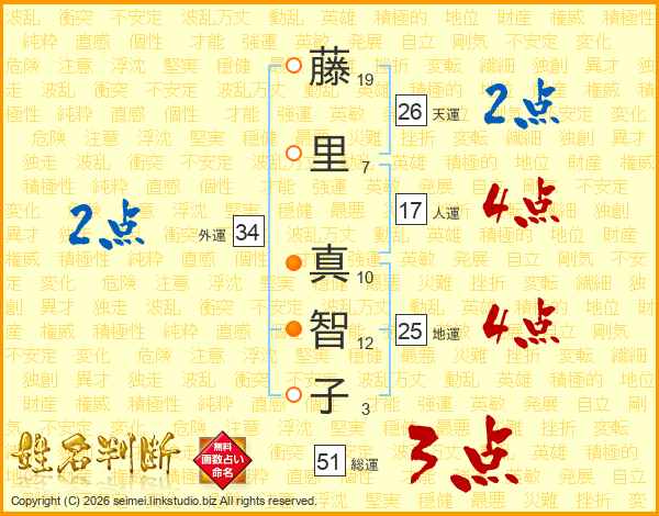 藤(19画)里(7画) 真(10画)智(12画)子(3画)
