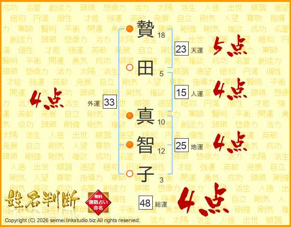 贄(18画)田(5画) 真(10画)智(12画)子(3画)