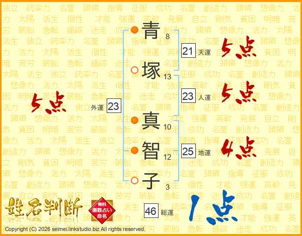 青(8画)塚(13画) 真(10画)智(12画)子(3画)