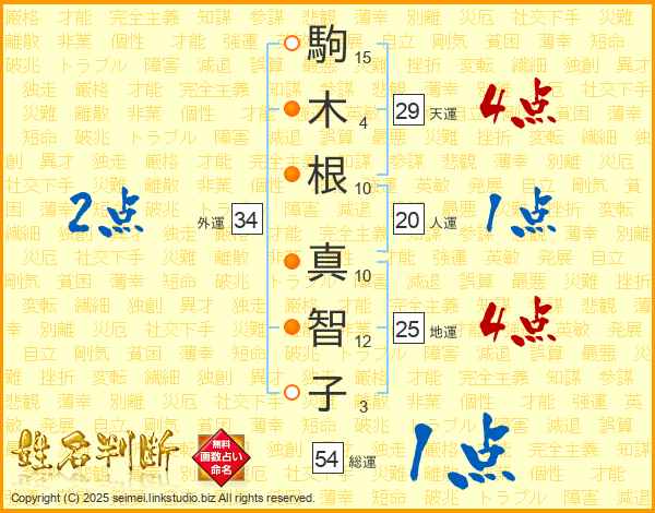 駒(15画)木(4画)根(10画) 真(10画)智(12画)子(3画)